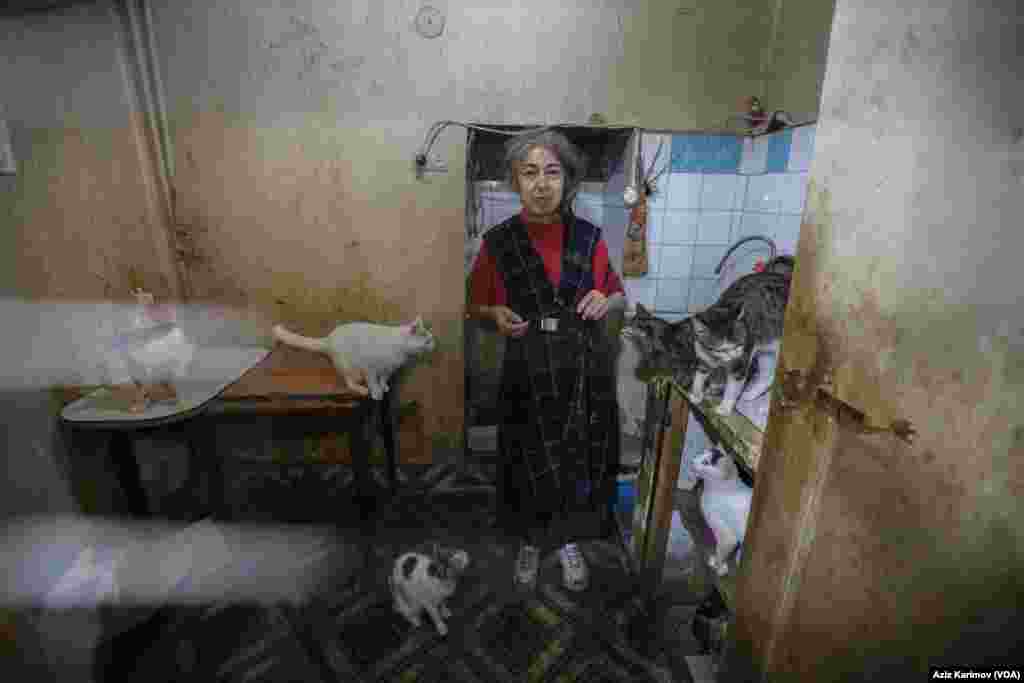 Elmira Ağadiyeva 8 ildir ki, evinin bir hissəsini pişiklər üçün sığınacaq edib. Heç bir yerdən gəliri olmamasına baxmayaraq, qonşuların köməyi ilə pişiklərin qayğısına qalır.