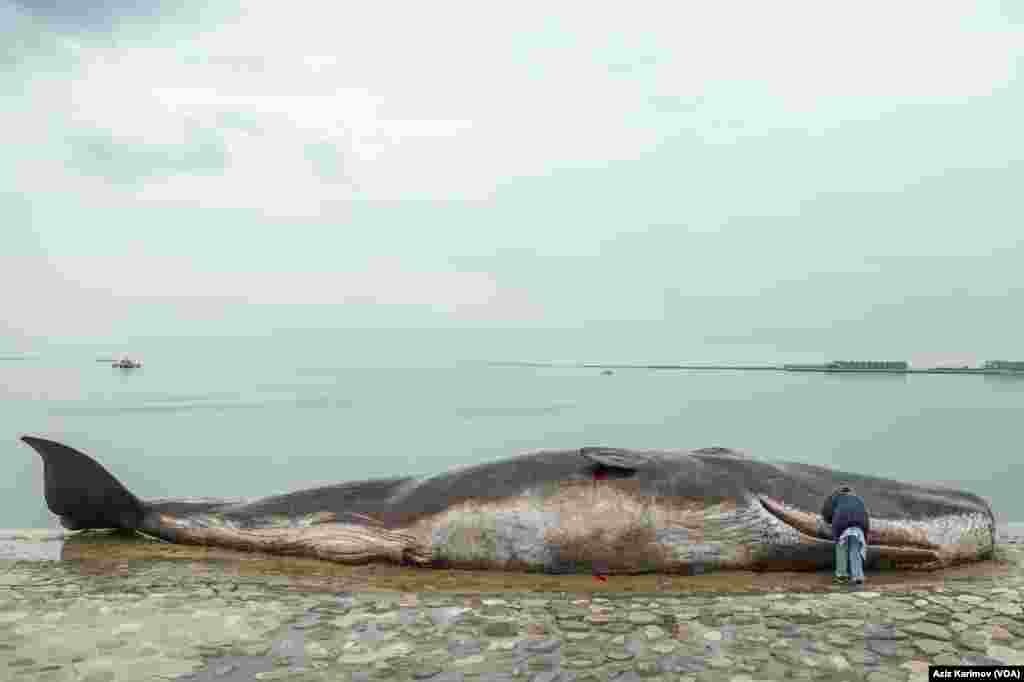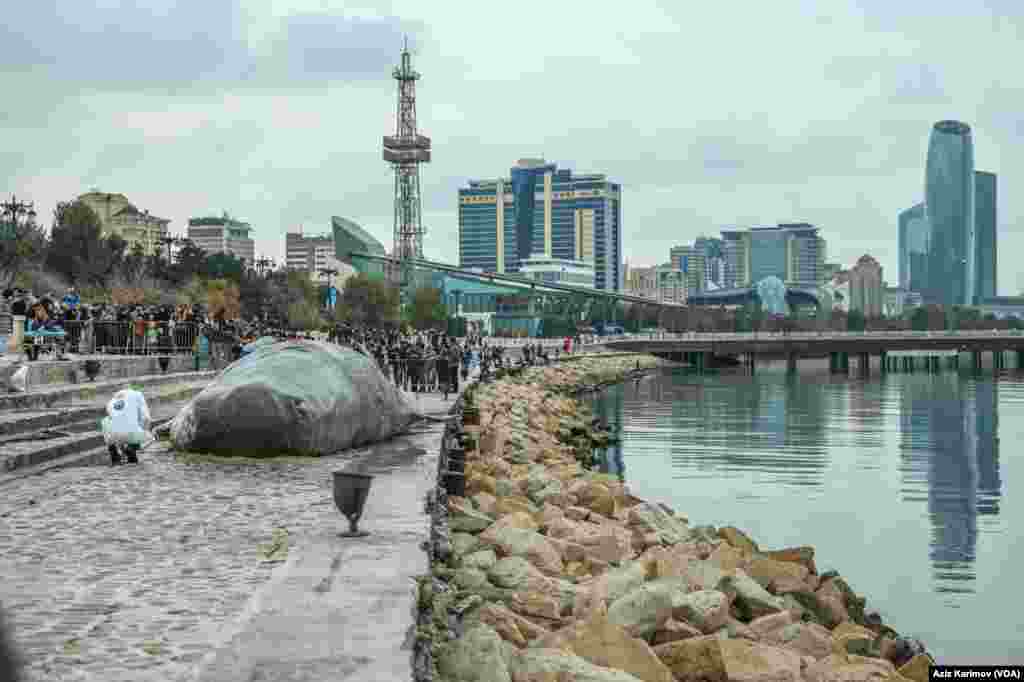 Xəzərin sahilində realistik balina maketi quraşdırılıb