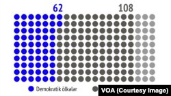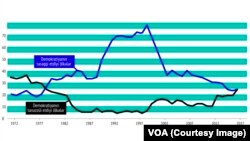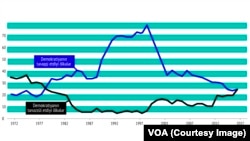Lakin bundan sonra nəsə baş verir. 38 il ərzində ilk dəfə olaraq demokratik tərəqqinin müşahidə ediliyi ölkələrlə demokratiyanın gerilədiyi ölkələrin sayı bərabərləşir.