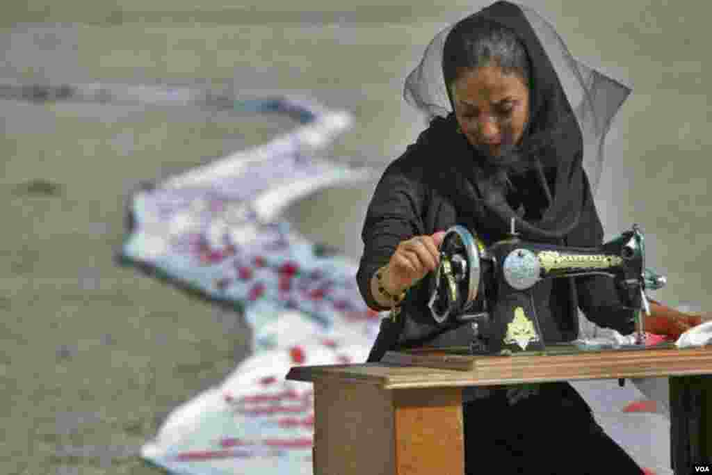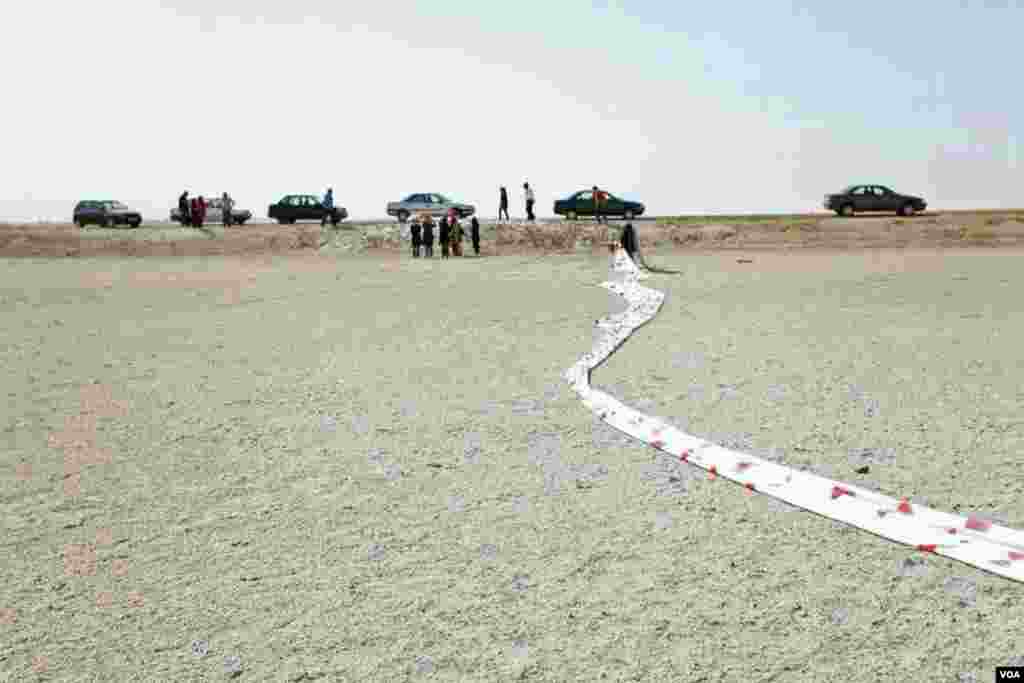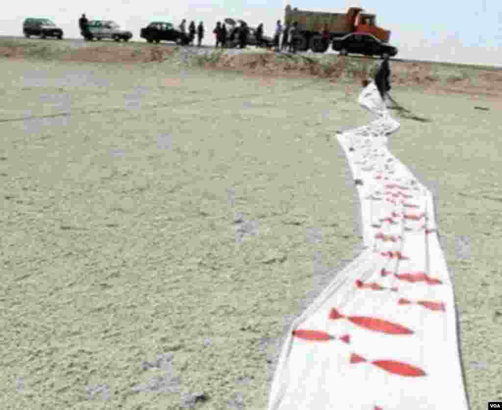 Güneyli bir qadın Urmiyə gölünün qurmasına diqqəti cəlb etmək üçün gölün kənarında simvolik şəkildə tikiş maşını ilə gölün balıqlarını ağ bezin üzərinə tikib. Uzunluğu onlarla metr olan ağ bezin üzərində qırmızı rəngdə balıq rəsmləri tikilib. Üzərində balıq rəsmləri olan bez parça gölün qurumuş hissələrində yerə sərilib.