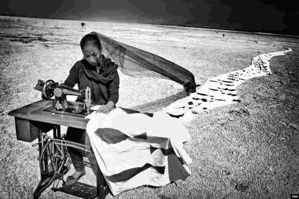 Güneyli bir qadın Urmiyə gölünün qurmasına diqqəti cəlb etmək üçün gölün kənarında simvolik şəkildə tikiş maşını ilə gölün balıqlarını ağ bezin üzərinə tikib. Uzunluğu onlarla metr olan ağ bezin üzərində qırmızı rəngdə balıq rəsmləri tikilib. Üzərində balıq rəsmləri olan bez parça gölün qurumuş hissələrində yerə sərilib.