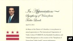Mer Vinsent Qreyin məktubunda Vaşinqtonda “Türk diyarının səsləri simfoniyası” adlı konsertin təşkilatçıları olan TÜRKSOY təşkilatı və Qarabağ Fonduna təşəkkür ifadə edilir. Mer Vinsent Qrey məktubunda bu təşkilatların Türk xalqları və Amerika xalqı arasında tərəfdaşlıq münasibətlərinin inkişafında göstərdiyi səyləri qeyd edir. “Sizi əldə etdiyiniz böyük nailiyyətlərə görə təbrik edirik və qarşıda yeni mədəniyyət proqramlarınızı gözləyirik. Vaşinqtonlular adından bu gözəl və yadda qalan tədbirlə bağlı sizə ən xoş arzularımı çatdırıram ”-deyə məktubda bildirilir.