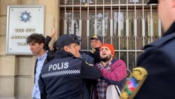 Hadisə yerinə gələn polis gənc fəalları saxlayaraq, əlləri ilə onların ağzını bağlayaraq binanın qarşısından uzaqlaşdırıblar.