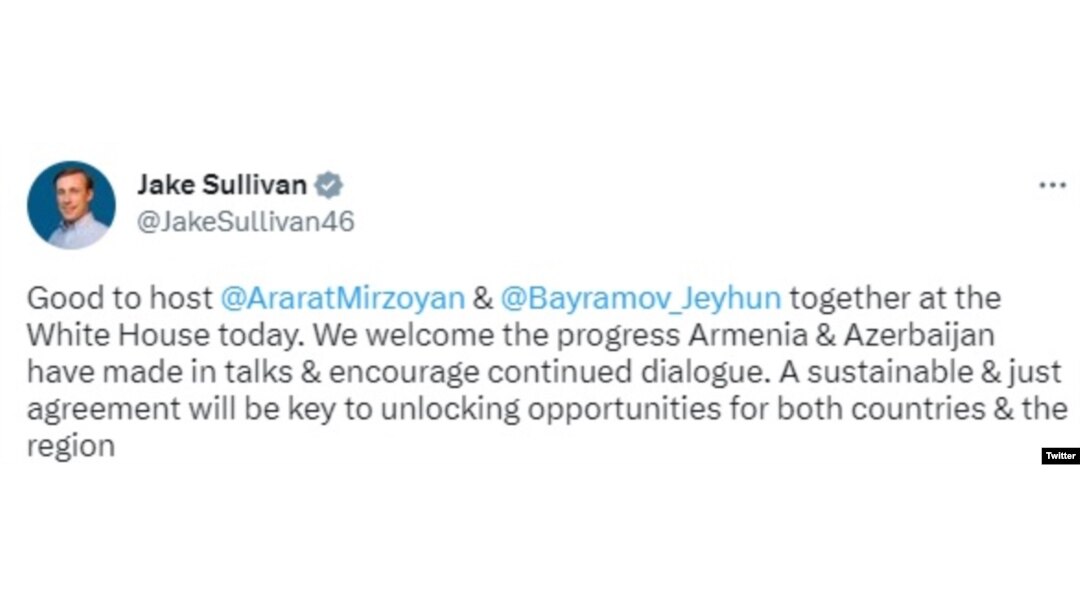 Bu barədə ABŞ Prezidentinin milli təhlükəsizlik məsələləri üzrə müşaviri Ceyk Sallivan Azərbaycanın və Ermənistanın xarici işlər naziri Ceyhun Bayramov və Ararat Mirzoyanla görüşündən sonra Twitter hesabında yazıb.