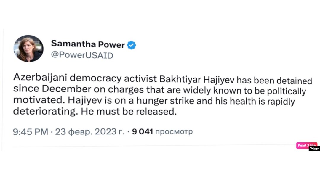 "Azərbaycanlı demokratik fəal Bəxtiyar Hacıyev dekabr ayından siyasi motivli ittihamlarla həbsdədir", ABŞ Beynəlxalq İnkişaf Agentliyinin (USAID) rəhbəri Samanta Pauer Twitter hesabında yazıb.